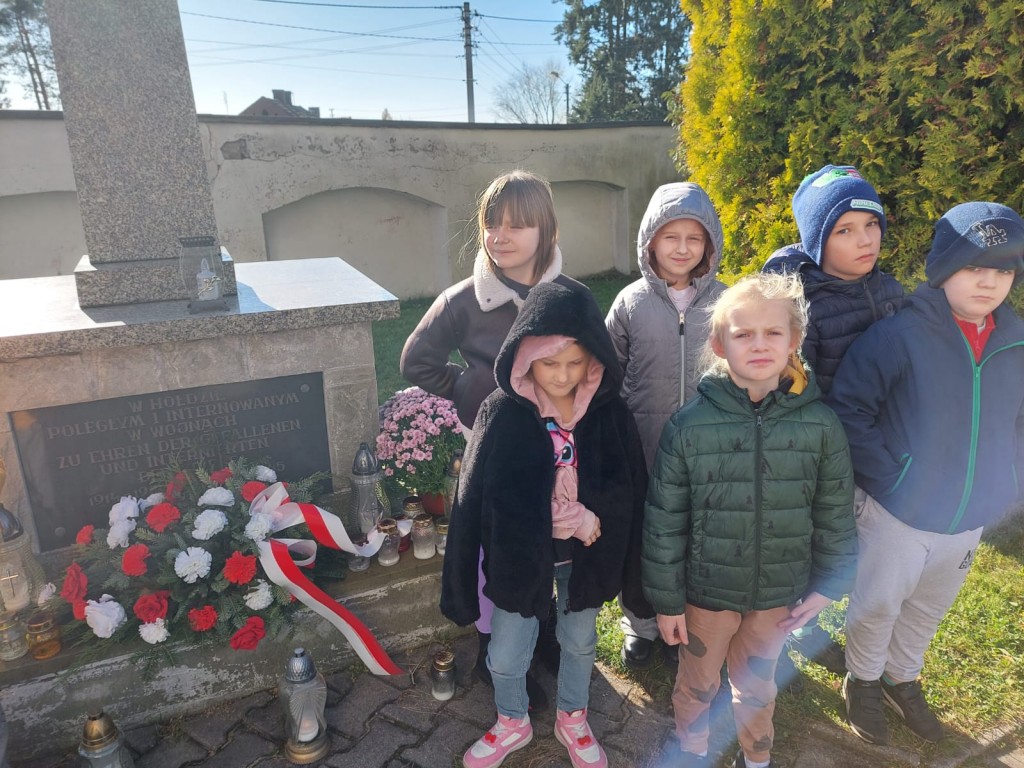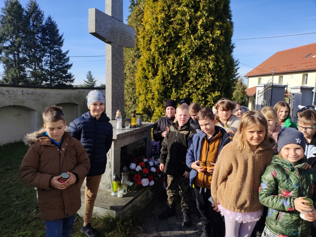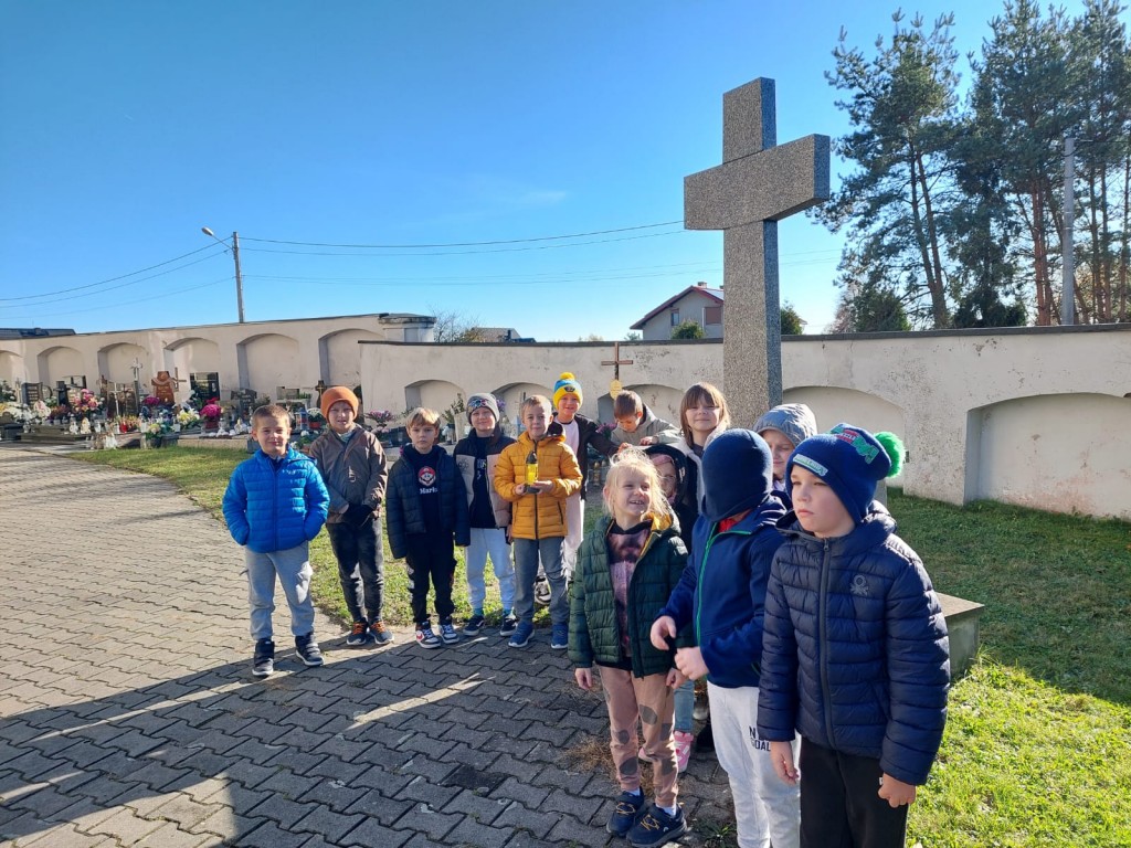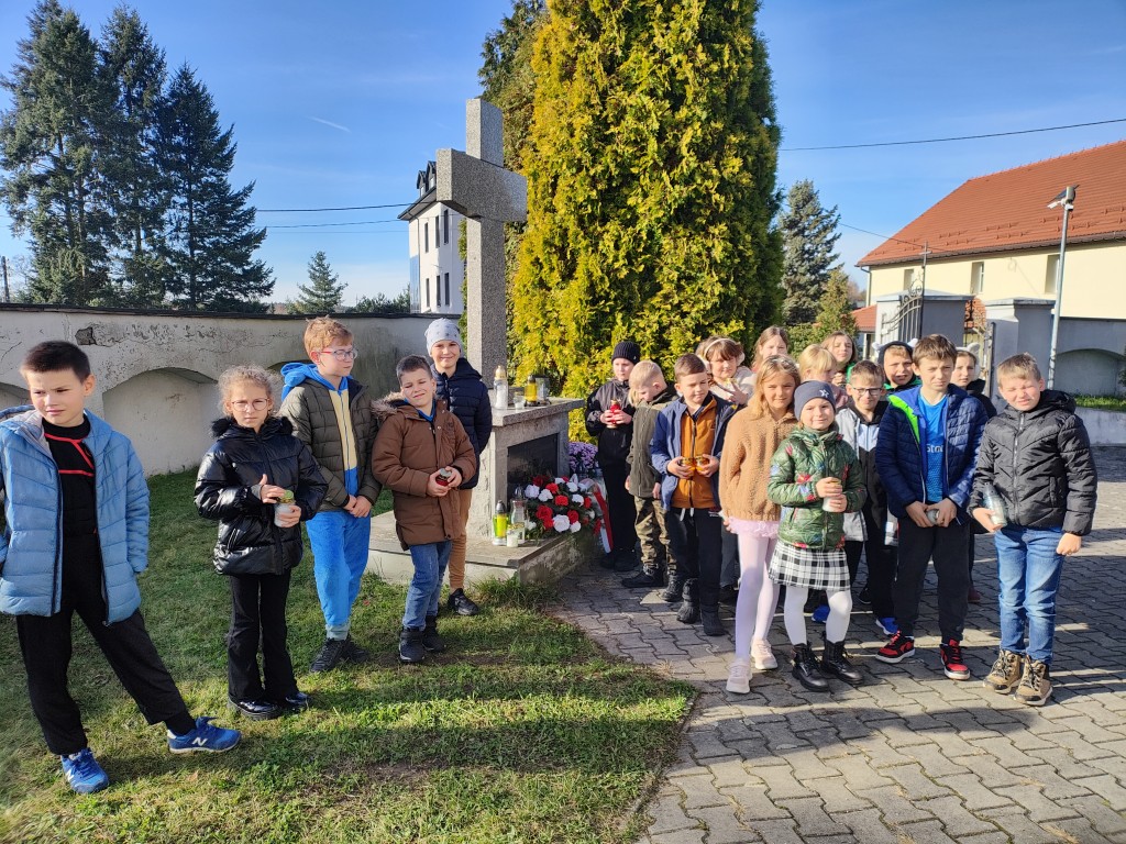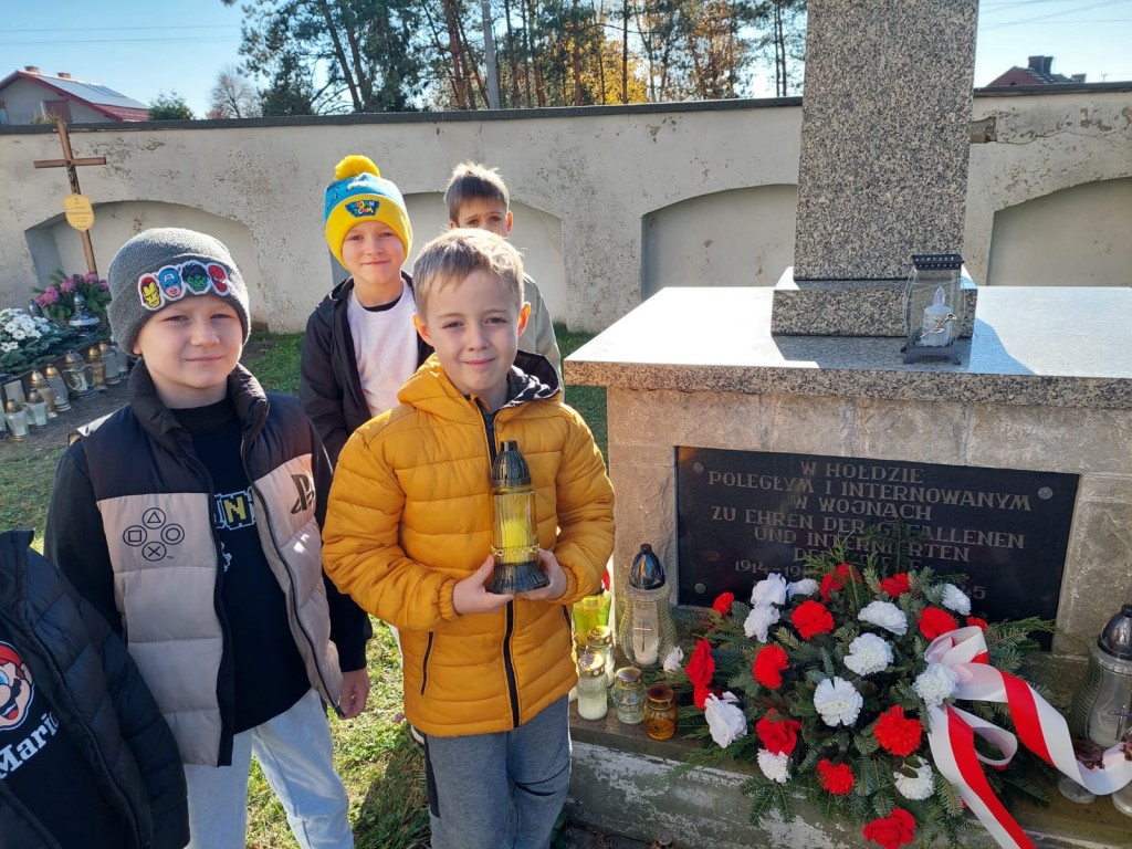 Na początku listopada uczniowie klas I–III odwiedzili cmentarz, gdzie zapalili znicze przy pomniku żołnierzy poległych i internowanych w czasie wojen. W ciszy i zadumie oddali hołd tym, którzy walczyli za ojczyznę. Była to wyjątkowa lekcja patriotyzmu, podczas której dzieci uczyły się pamięci, szacunku i wdzięczności wobec bohaterów narodowych. Wspólne odwiedziny miejsca pamięci stały się okazją do refleksji nad wartością wolności oraz do rozmowy o znaczeniu historii i tradycji narodowej.