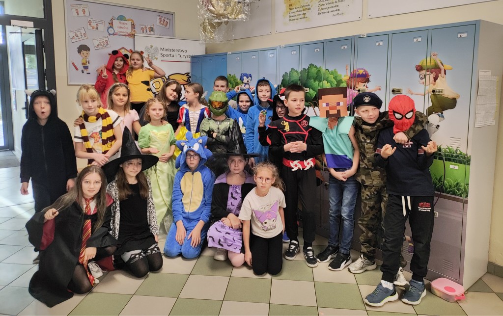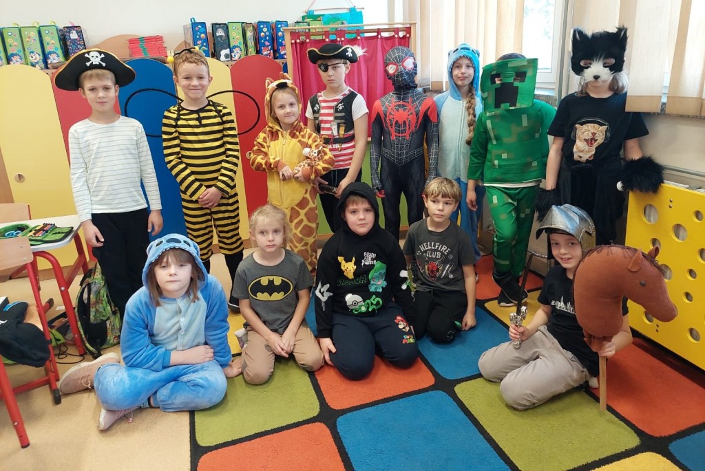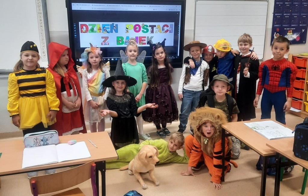 5 listopada uczniowie klas I–III świętowali Dzień Postaci z Bajek. Tego dnia szkoła zamieniła się w bajkową krainę pełną barwnych bohaterów — dzieci przyszły przebrane w piękne stroje swoich ulubionych postaci. Podczas wspólnej zabawy uczniowie słuchali fragmentów znanych bajek i baśni, rozwiązywali zagadki, rozpoznawali bohaterów po ilustracjach i melodiach, a także wykonywali rysunki przedstawiające swoich ulubionych bajkowych przyjaciół. To wyjątkowe wydarzenie przypomniało wszystkim, jak wielką rolę bajki odgrywają w dzieciństwie i jak ważne jest, by do nich często powracać.