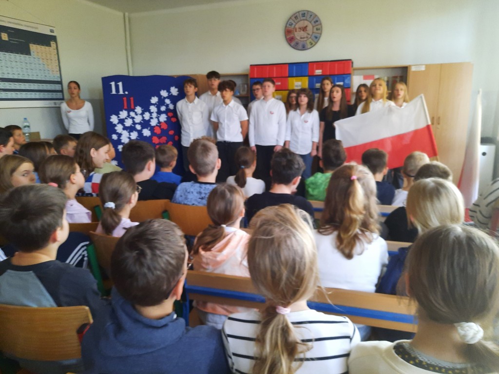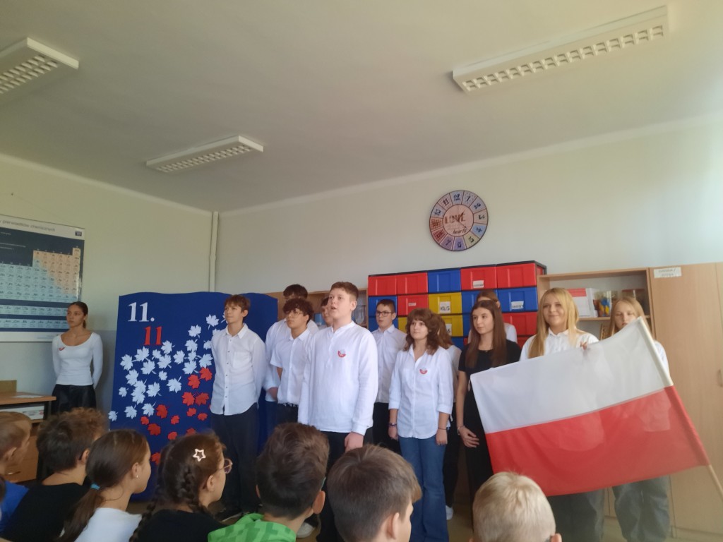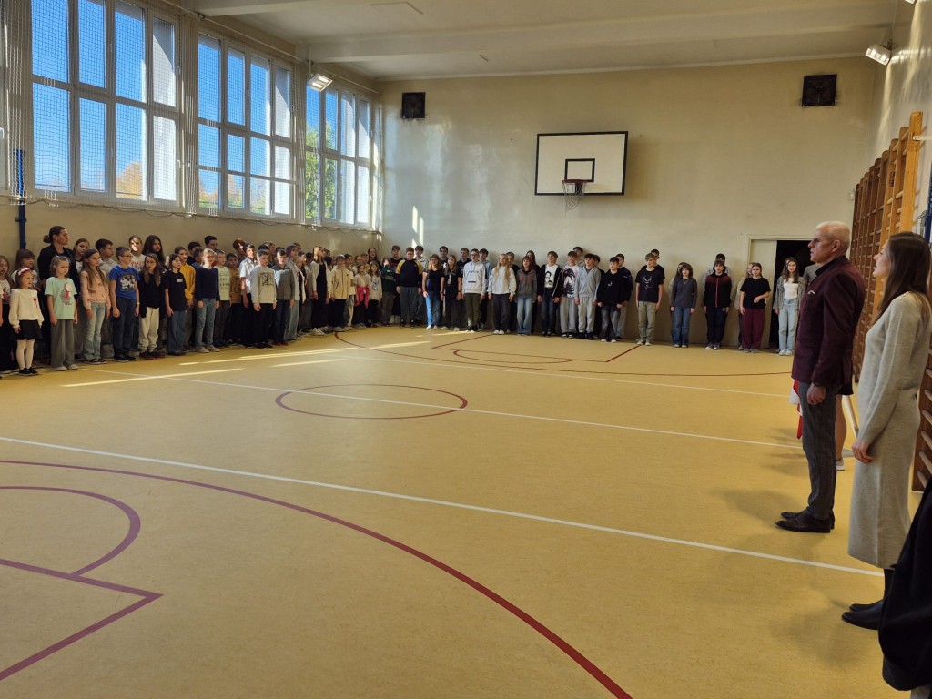 W naszej szkole obchody Święta Niepodległości rozpoczęły się 7 listopada. Tego dnia cała społeczność szkolna wzięła udział w ogólnopolskiej akcji „Do Hymnu”. O godzinie 11:11 wszystkie klasy zebrały się na sali gimnastycznej, aby wspólnie odśpiewać „Mazurek Dąbrowskiego”. Uroczysty śpiew stworzył podniosłą atmosferę i przypomniał o znaczeniu tego ważnego wydarzenia w historii naszego kraju.