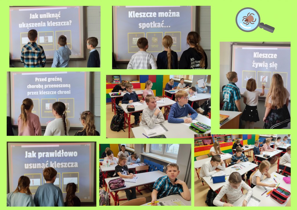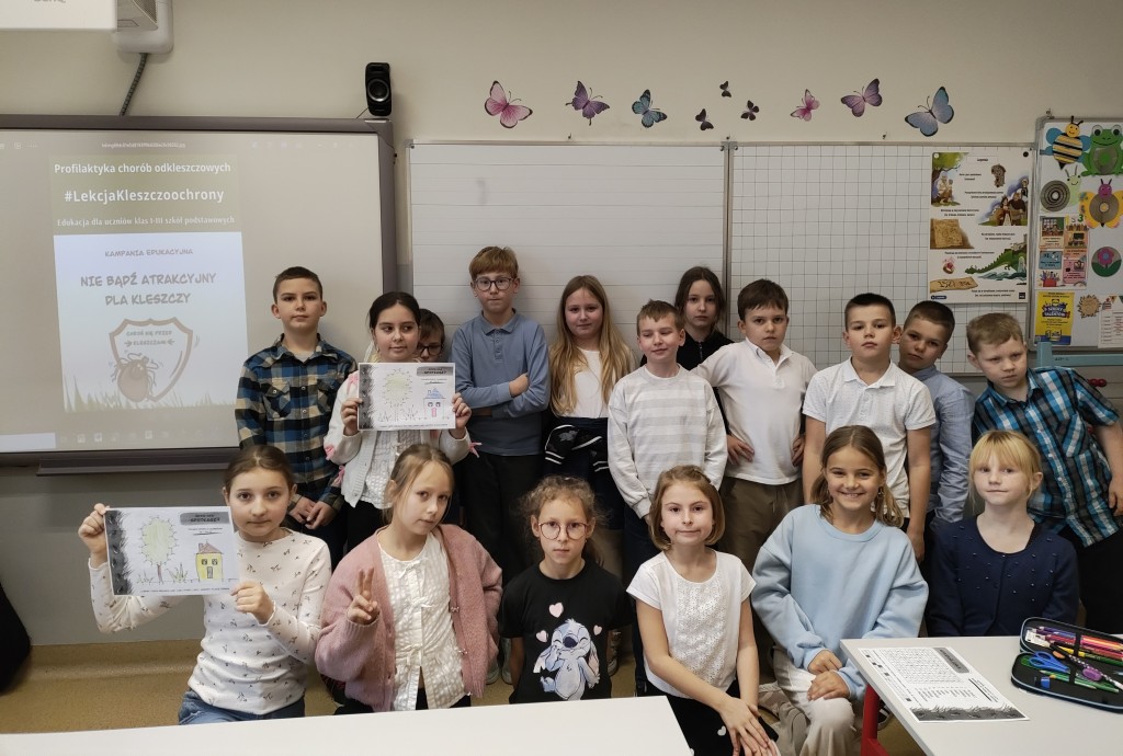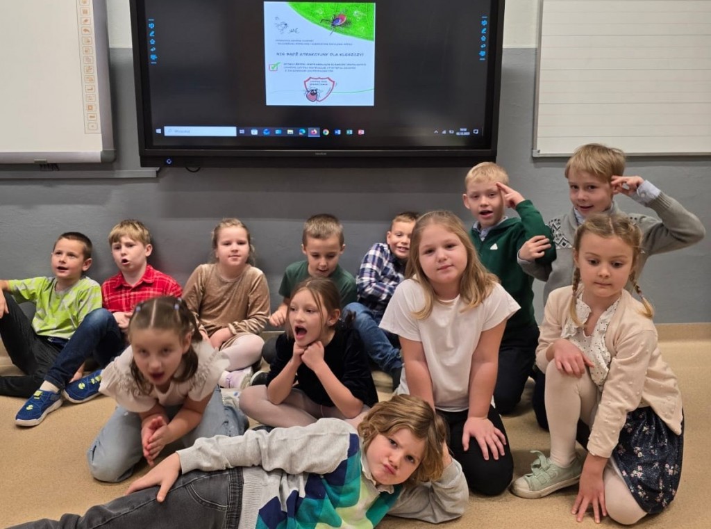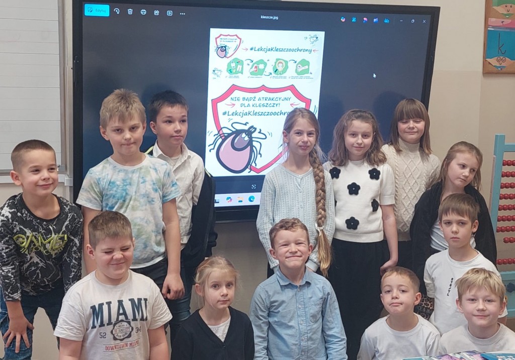Uczniowie klas I–III wzięli udział w zajęciach edukacyjnych #LekcjaKleszczoochrony w ramach kampanii „Nie bądź atrakcyjny dla kleszczy”. Podczas zajęć dzieci dowiedziały się, czym są kleszcze, jakie zagrożenia dla zdrowia niosą oraz w jakich miejscach występują. Omówiono choroby odkleszczowe, w tym boreliozę i kleszczowe zapalenie mózgu, a także zasady ochrony przed ukąszeniami i prawidłowego usuwania kleszcza. Uczniowie obejrzeli prezentację i film edukacyjny, co zwiększyło ich świadomość zagrożeń oraz znaczenie profilaktyki i szczepień ochronnych.