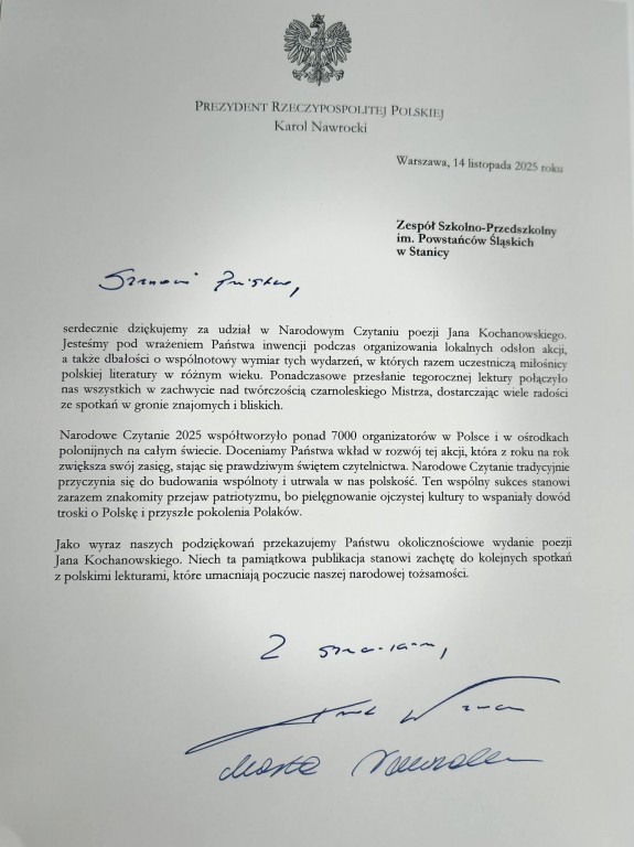 Jako Zespół Szkolno-Przedszkolny w Stanicy otrzymaliśmy podziękowania płynące od Prezydenta Rzeczpospolitej Polskiej- Karola Nawrockiego oraz jego małżonki- Marty Nawrockiej za zorganizowanie w dniu 16 września, przez panią Tamarę Kokot- Małańczak, dyrekcję i uczniów klas 5, 7 i 8 Narodowego Czytania poezji Jana Kochanowskiego.