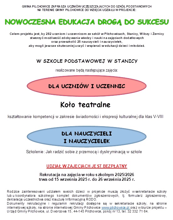 Projekt będzie realizowany do 31 sierpnia 2027 r. w Gminie Pilchowice, w powyższych Zespołach Szkolno-Przedszkolnych. Zajęcia, czas ich trwania oraz forma prowadzenia będą dopasowane do potrzeb uczniów. Cel projektu zostanie osiągnięty poprzez realizację zajęć dodatkowych dla uczniów w zakresie zajęć wyrównawczych, rozwijających oraz kół zainteresowań i warsztatów. Nauczyciele podniosą kwalifikacje zawodowe poprzez uczestnictwo w kursach oraz szkoleniach. Dodatkowo zostaną zakupione pomoce dydaktycznych oraz sprzętu ICT, które są niezbędne do osiągnięcia celu projektu.