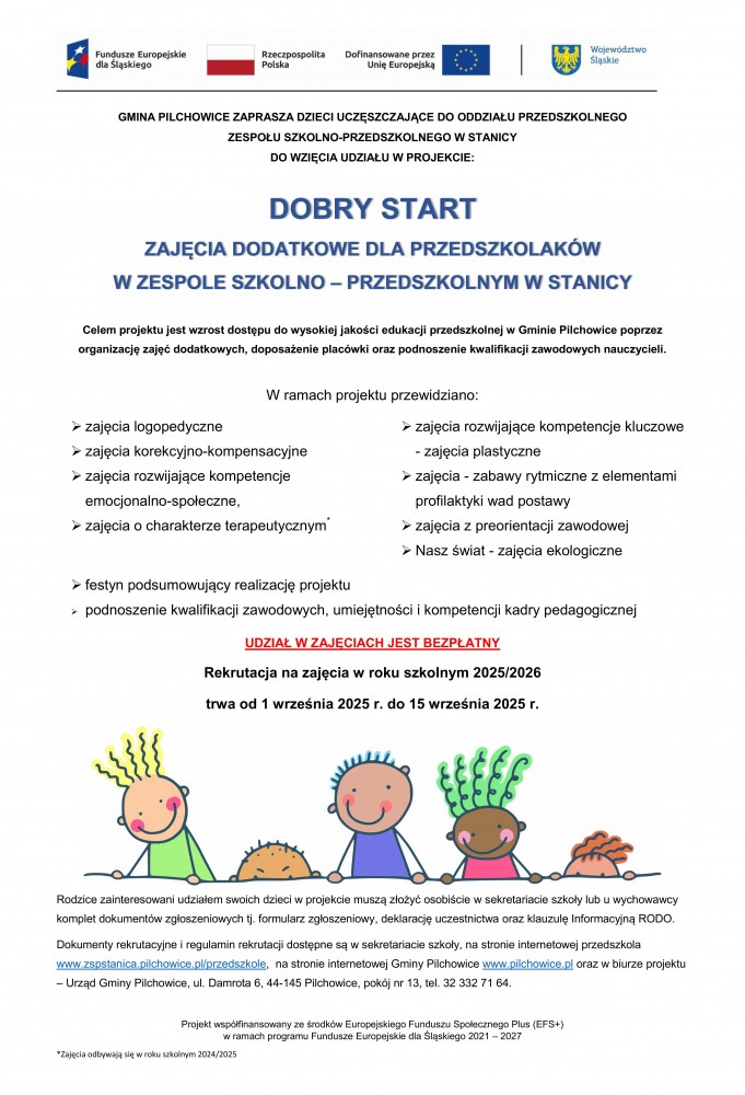 Projekt będzie realizowany do sierpnia 2027 r. w sołectwie Stanica, w Gminie Pilchowice. Zajęcia, ich forma i czas trwania są dostosowane do indywidualnych potrzeb dzieci. Projekt zapewnia bezpieczne i higieniczne warunki nauki, wspiera start edukacyjny dzieci oraz ułatwia rodzicom powrót na rynek pracy, a nauczycielom dostosowanie kształcenia do potrzeb uczniów.