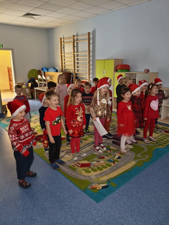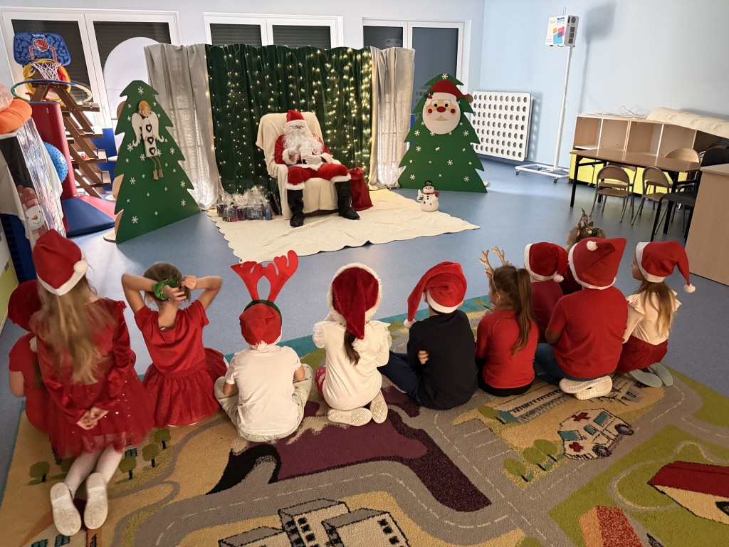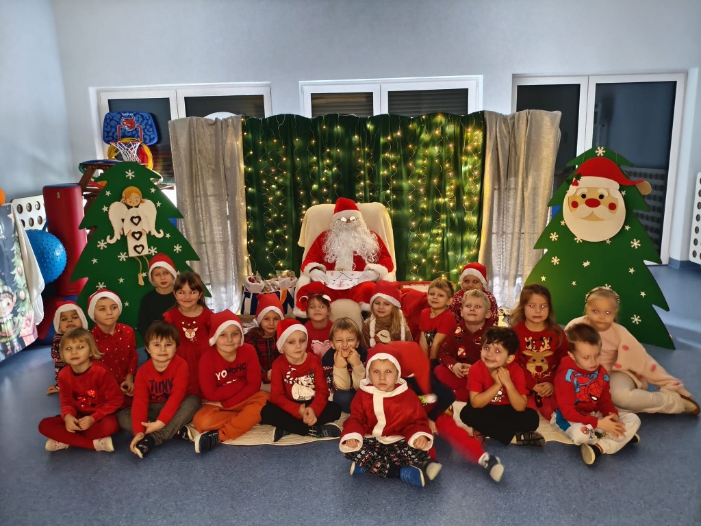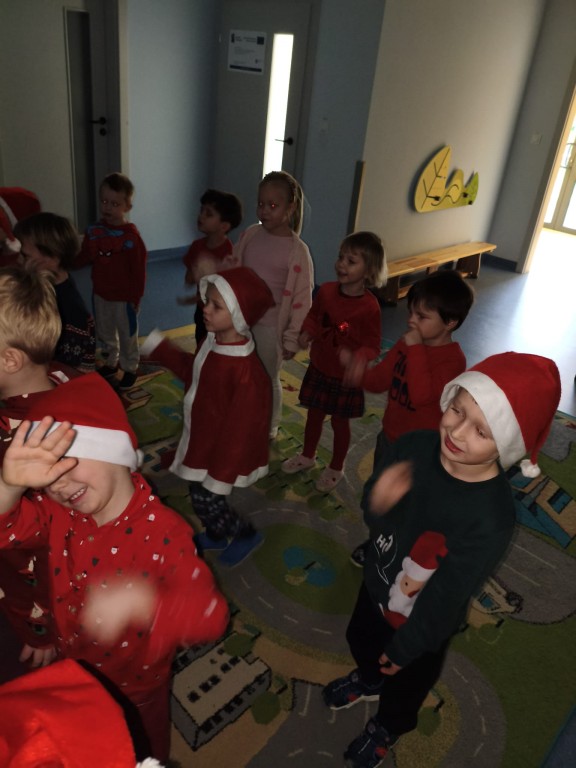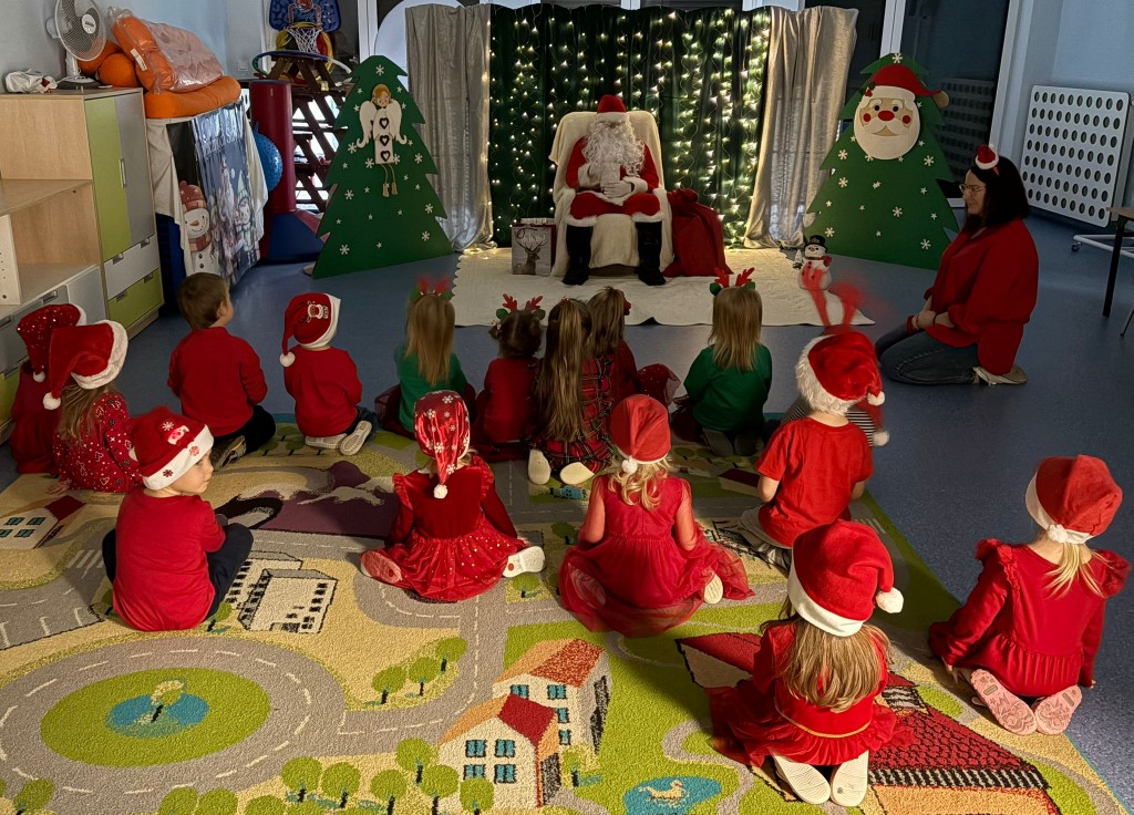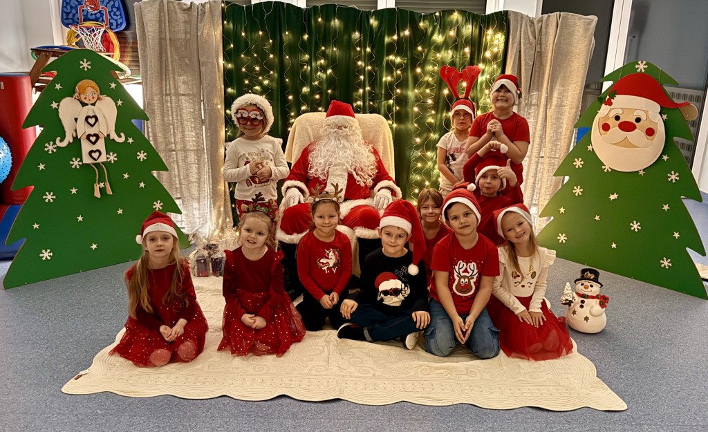 Dziś nasze przedszkole odwiedził wyjątkowy gość- Święty Mikołaj! Zanim wręczył dzieciom wyczekiwane upominki, każda z grup zaśpiewała mu świąteczną piosenkę. Mali artyści byli bardzo zaangażowani, a Mikołaj nie krył zachwytu ich występami. Spotkanie było pełne radości i uśmiechów, na długo pozostanie w naszej pamięci!