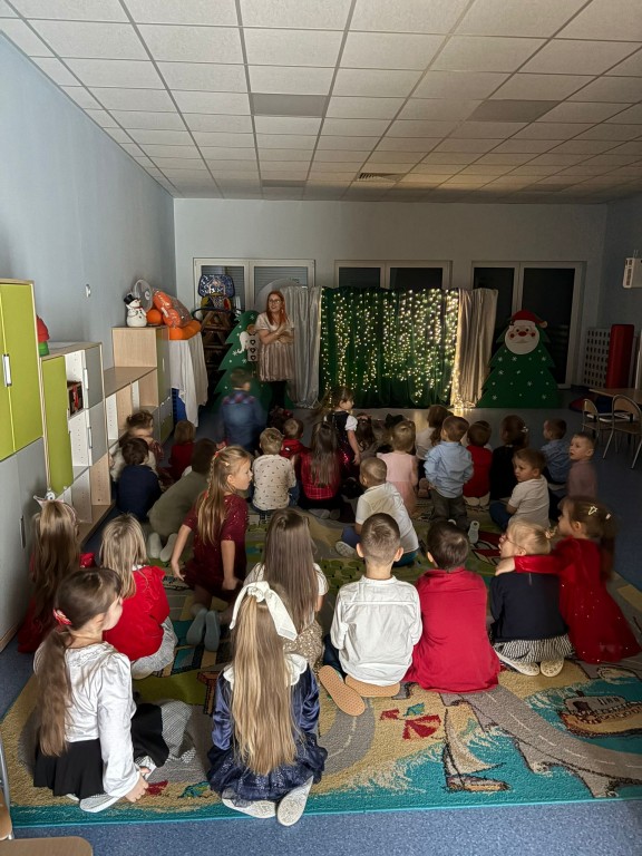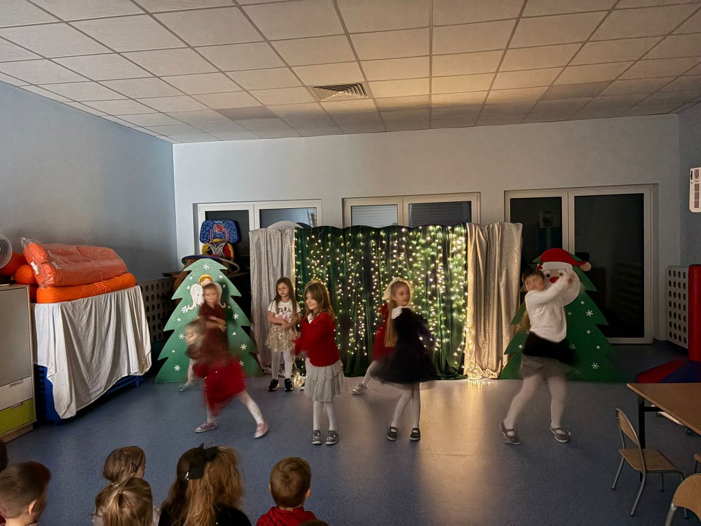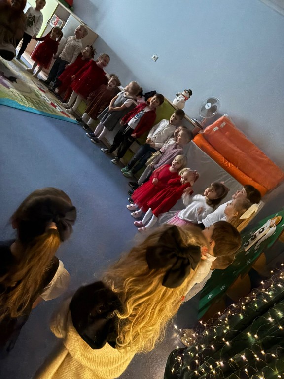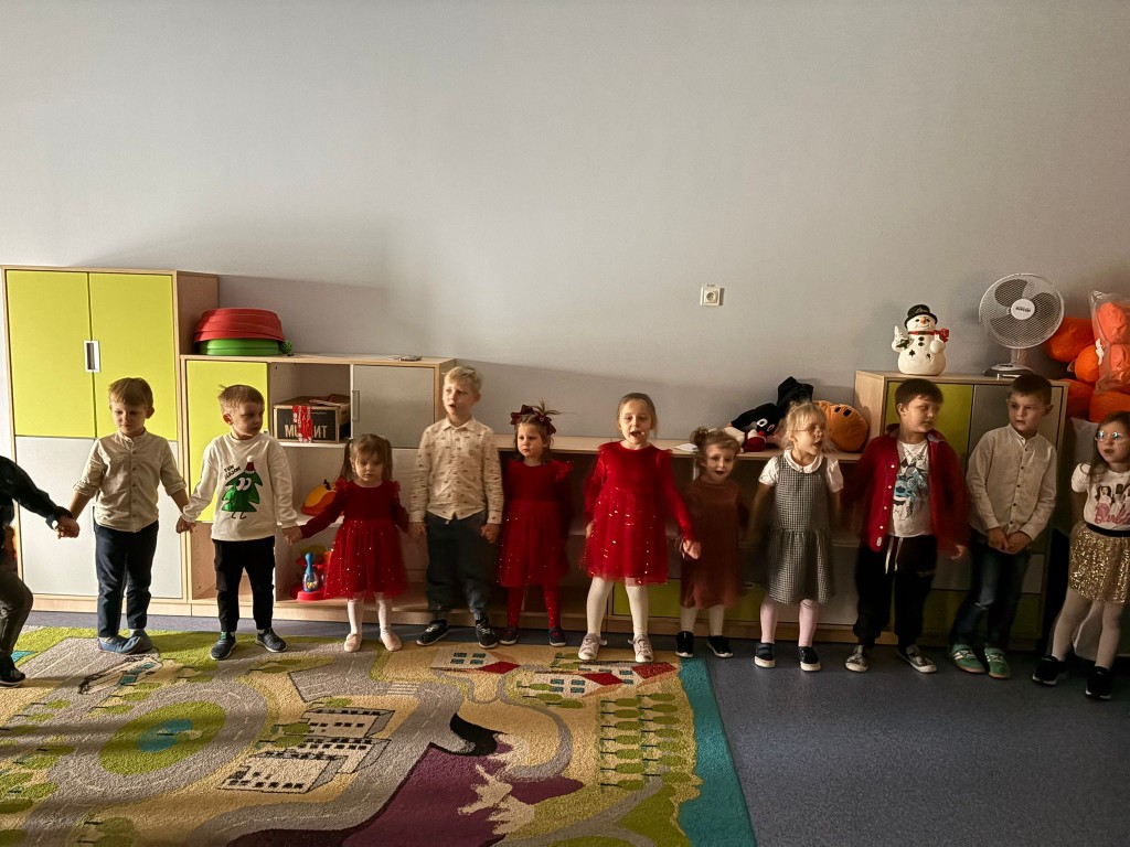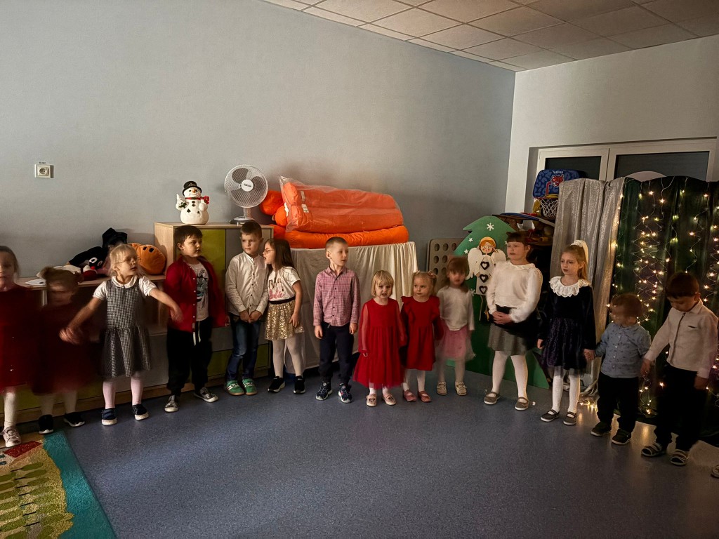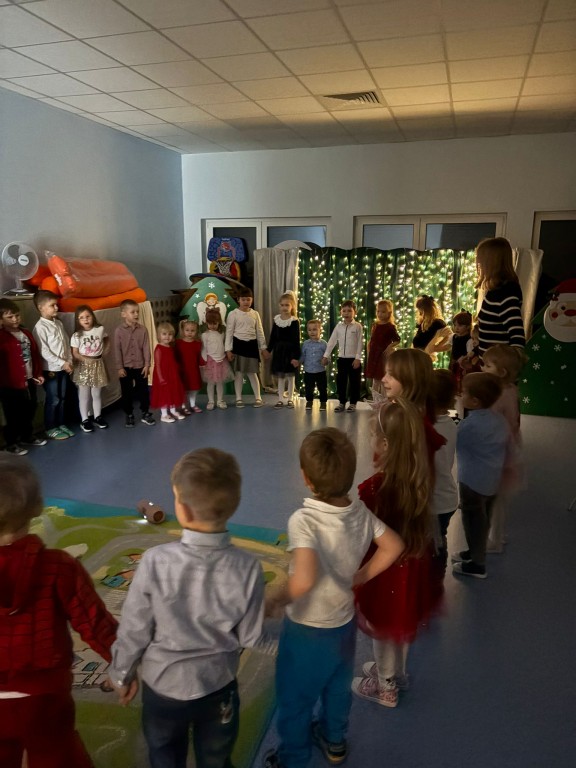 W naszym przedszkolu zapanowała wyjątkowa, świąteczna atmosfera. Wszystkie dzieci spotkały się na wspólnym kolędowaniu. Zaśpiewaliśmy chętnie znane nam kolędy i pastorałki. Każdy z nas złożył kolegom i koleżankom życzenia z okazji zbliżających się Świąt Bożego Narodzenia. Następnie każda z grup udała się do swojej sali, aby wspólnie ze swoimi Paniami spędzić Wigilijkę.