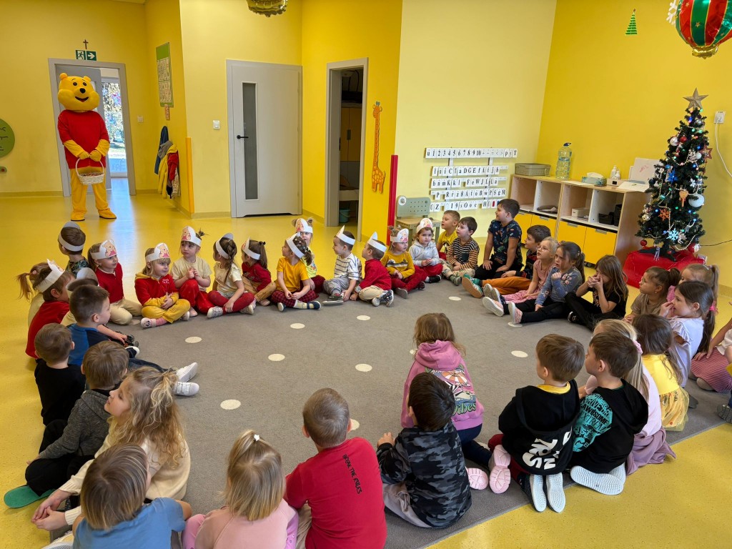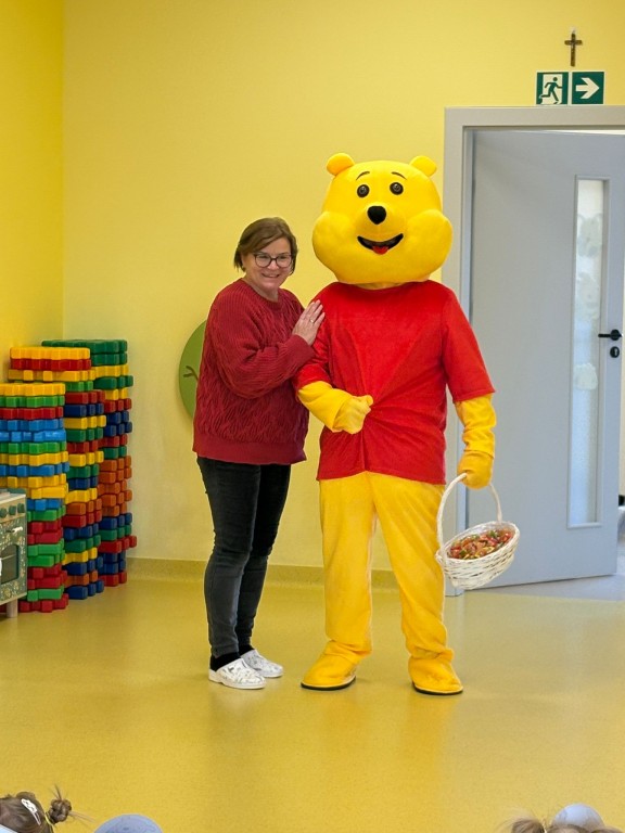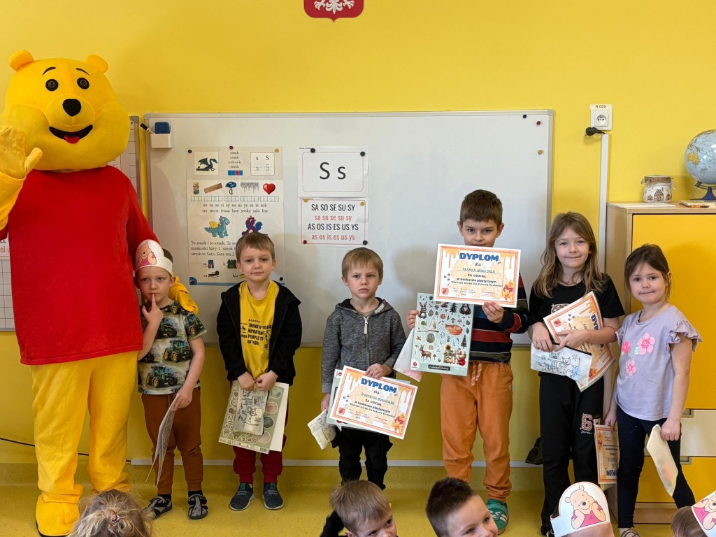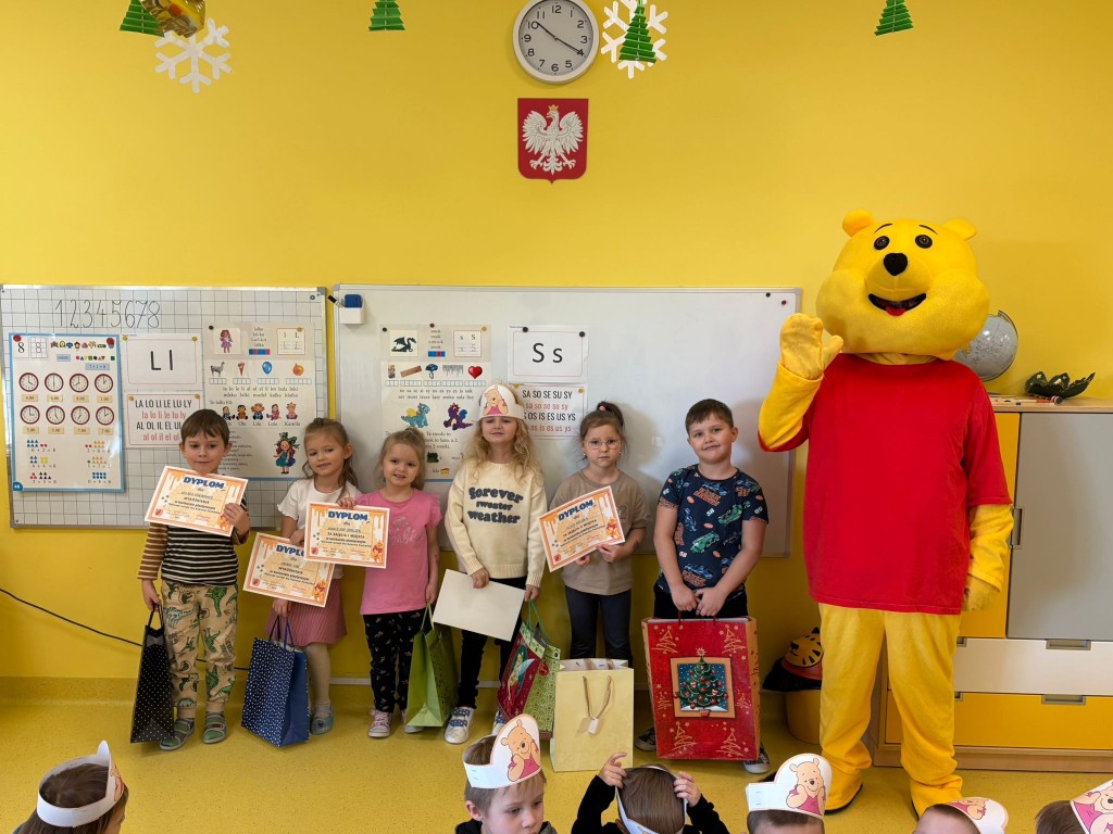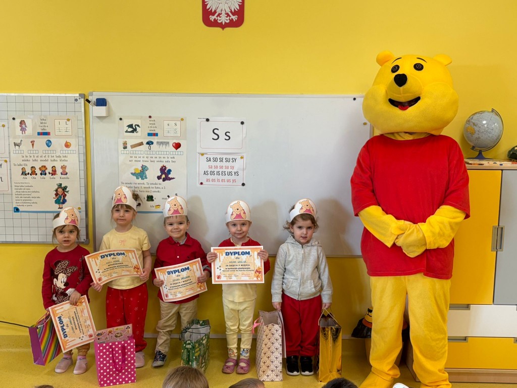 Największą atrakcją tego dnia były odwiedziny samego Kubusia Puchatka, który podziękował dzieciom za udział w przedszkolnym konkursie plastycznym i wręczył nagrody zwycięzcom oraz pozostałym uczestnikom konkursu.